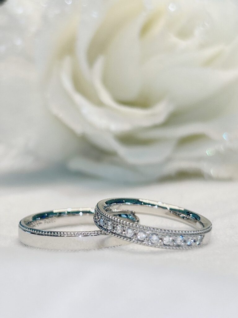 上下にミル打ちを施したマリッジリングのダイヤ入りモデルは
