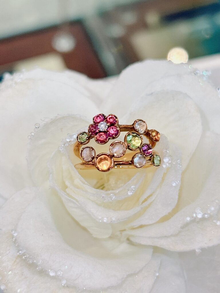 フラワーモチーフのリングはこの季節に使いたい華やかで存在感あるアイテムです